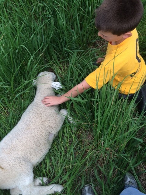 Once we arrived we unloaded the sheep. Aiden was so excited! I think he figured they'd be more tame and want to 'play' with him right away. Seeing how wild they are was a surprise to him. Aiden wanted to try putting a halter on one right away so after a few attempts at catching one we got it haltered. Aiden named him, one of the 2 wethers (male sheep that's been castrated), Nubbie because it had 2 nubs of horns on it's head. After keeping him on the halter for a few minutes and petting him all over to get him used to being handled he laid down. We took the halter off and it stayed there on the ground so Aiden sat beside Nubs and pet him some more. It was a pretty neat moment for him.